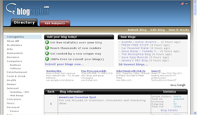 Blogarama : Cool weblog directory currently having more than 69,000 blogs.It will list the blogs in terms of the score your blog have.The score depends on so many things like incoming traffic,outgoing traffic,user ratings,etc. and if you send more traffic to they,they will list your blog in the top 100 blogs.